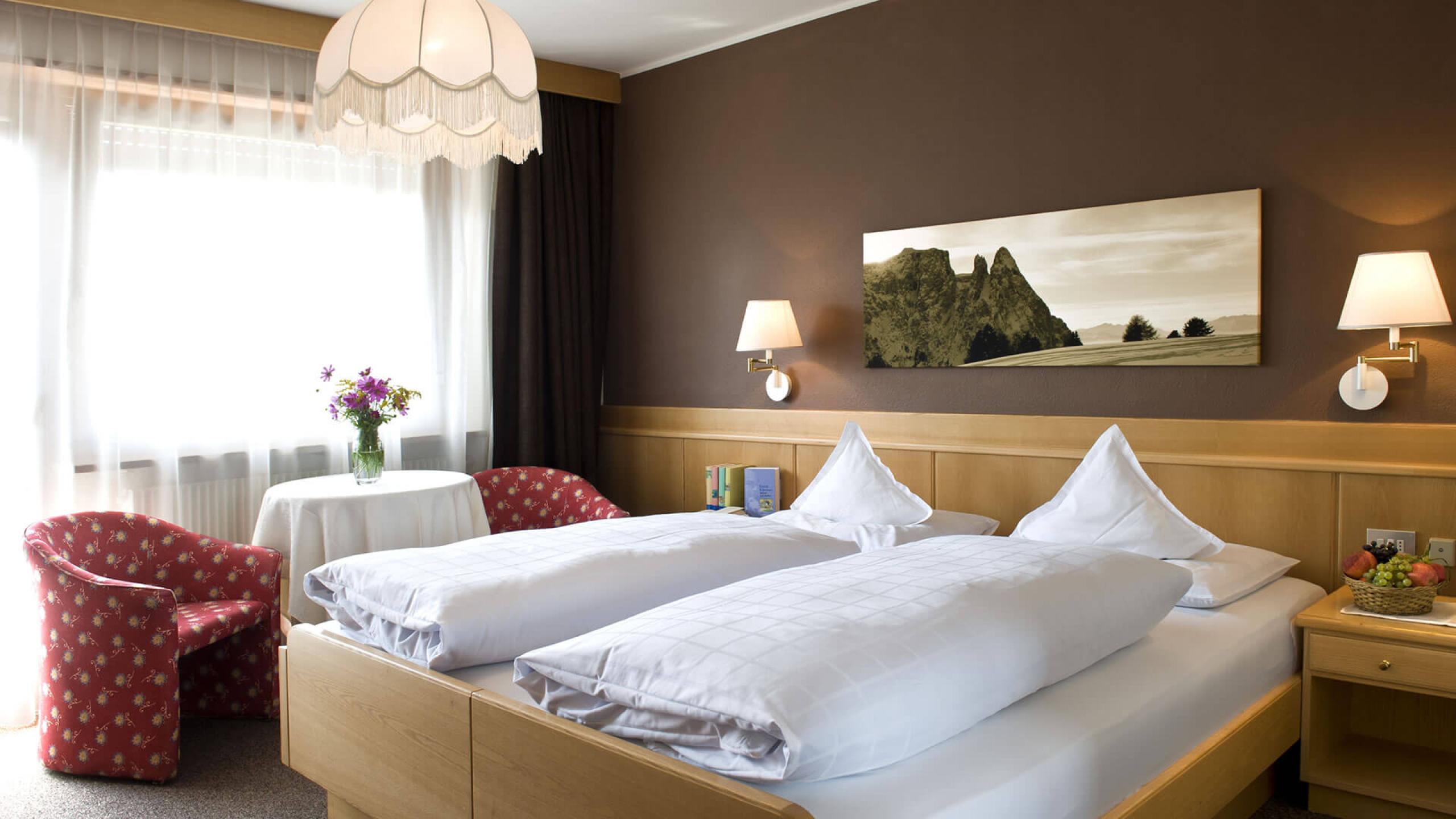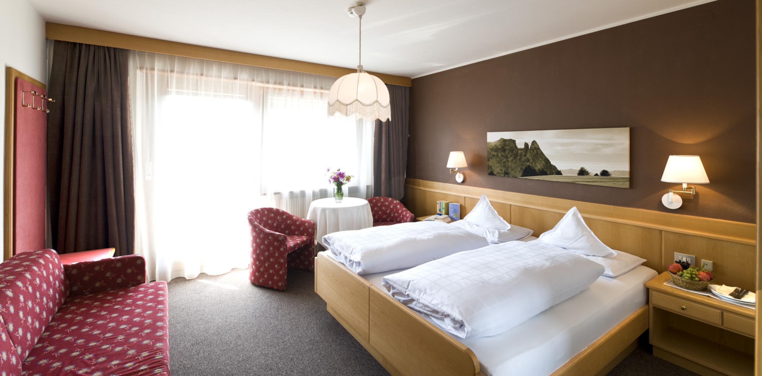 Comfy double rooms with double bed, sofa bed (mattress 180 cm), table, telephone, satellite TV, bathroom with shower, bidet, hairdryer and balcony with view of Castelrotto/Kastelruth or San Michele/St. Michael.