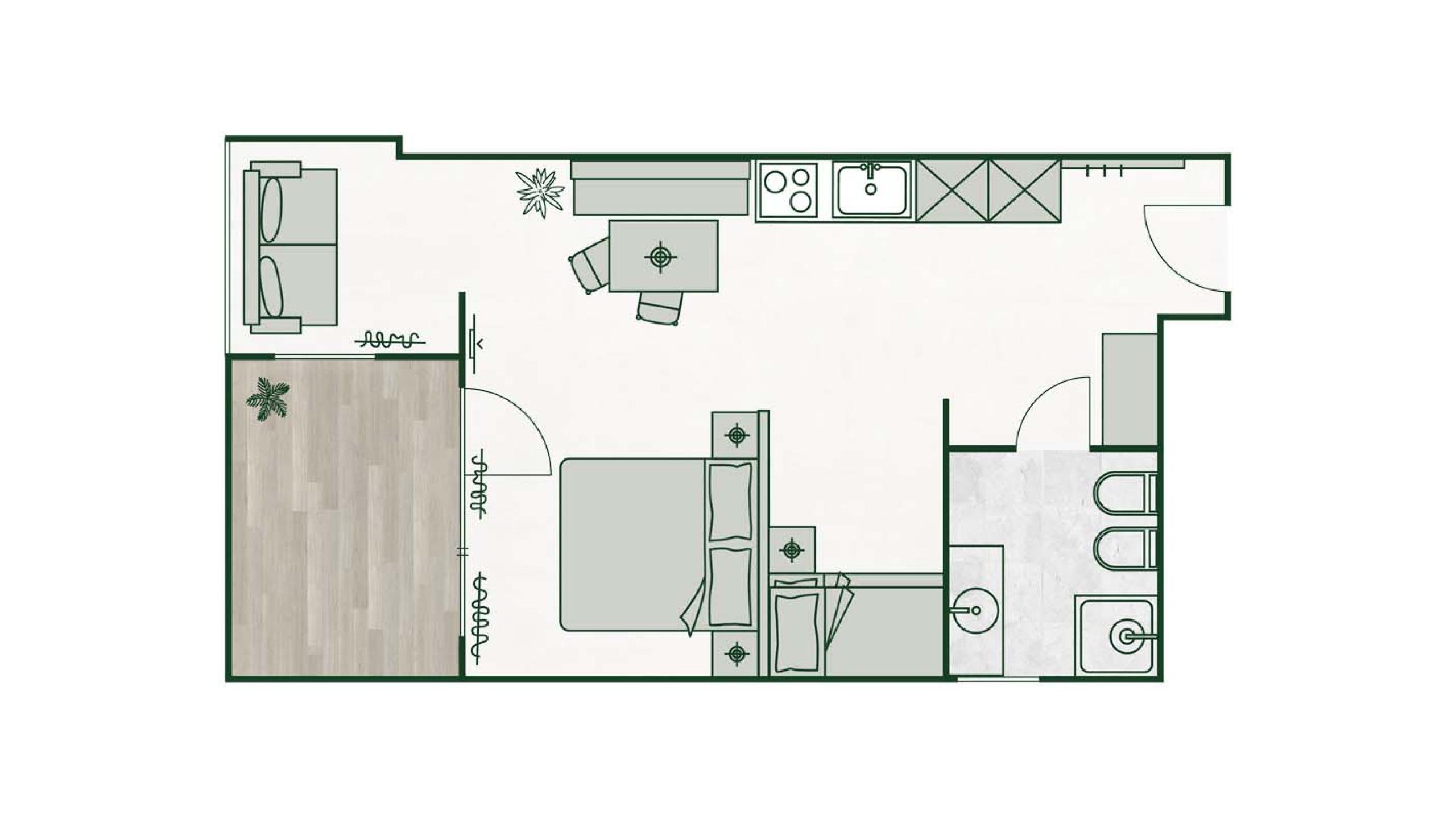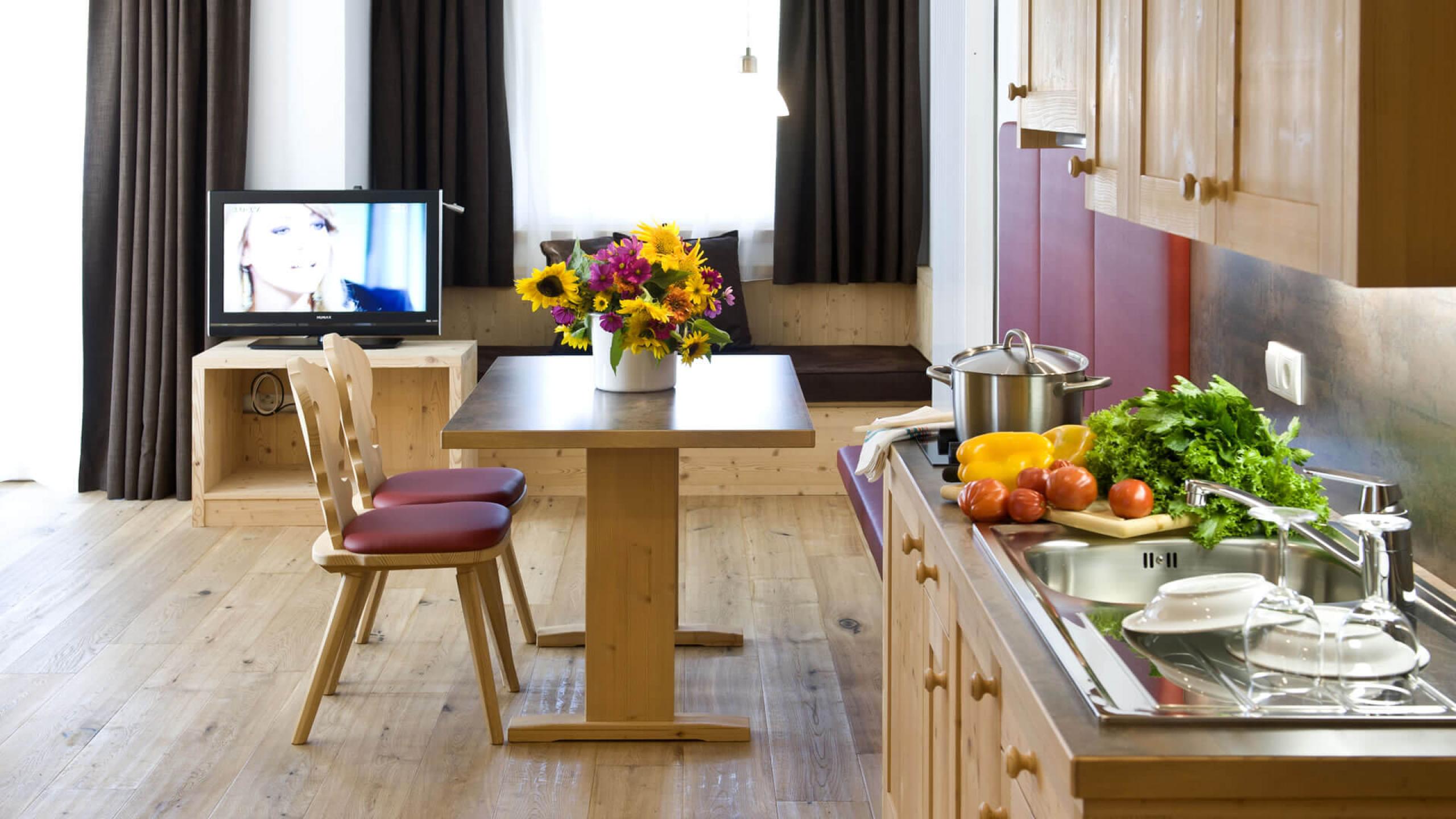 Komfortable und sehr geräumige Miniapartments mit Doppelbett, Einzelbett, Stockbett, Küchenzeile, Sitzecke, Telefon, Sat-TV, Bad mit Dusche und Bidet, Föhn und Balkon mit Blick auf den Schlern und Puflatsch.