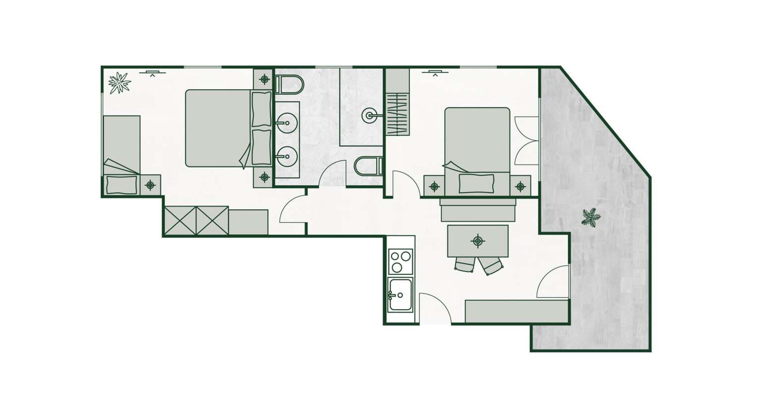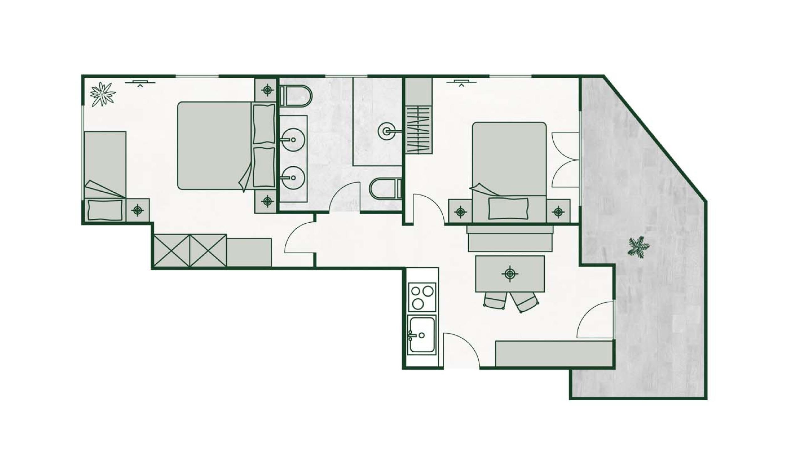 Neues Apartment mit Küche mit Esstisch, Balkon, 2 getrennte Schlafzimmer (ein Zimmer hat ein Ehebett, das andere ein Ehebett und ein Einzelbett), Telefon, Sat-TV und Bad mit Dusche, Bidet und Fön.
